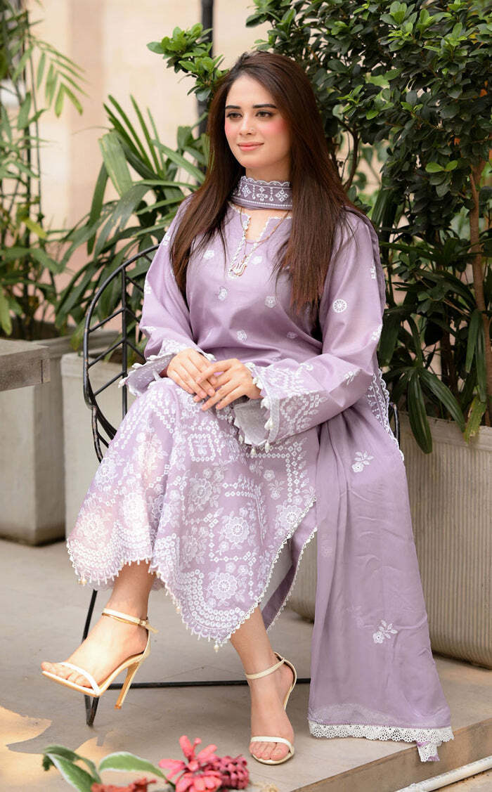 3 Pcs Suit(Shirt Dopatta trouser)Brand code 3147Dhanak Emb Heavy shawlFront EmbSleevs EmbBorder EmbTrouser EmbSame as orignal